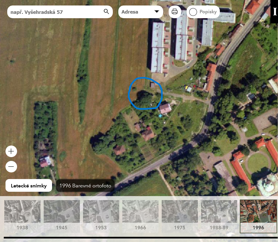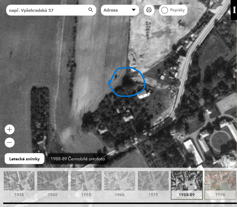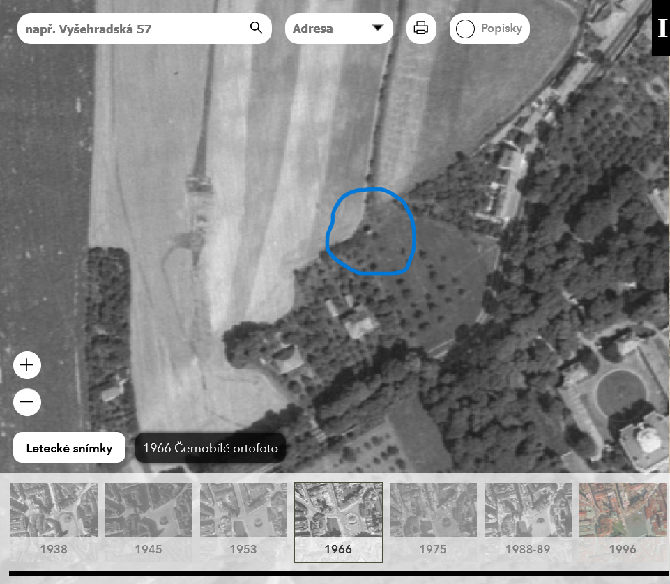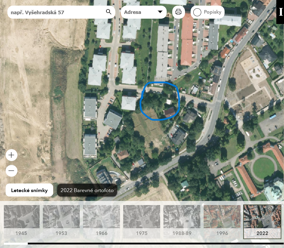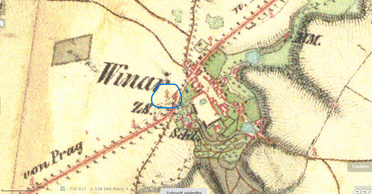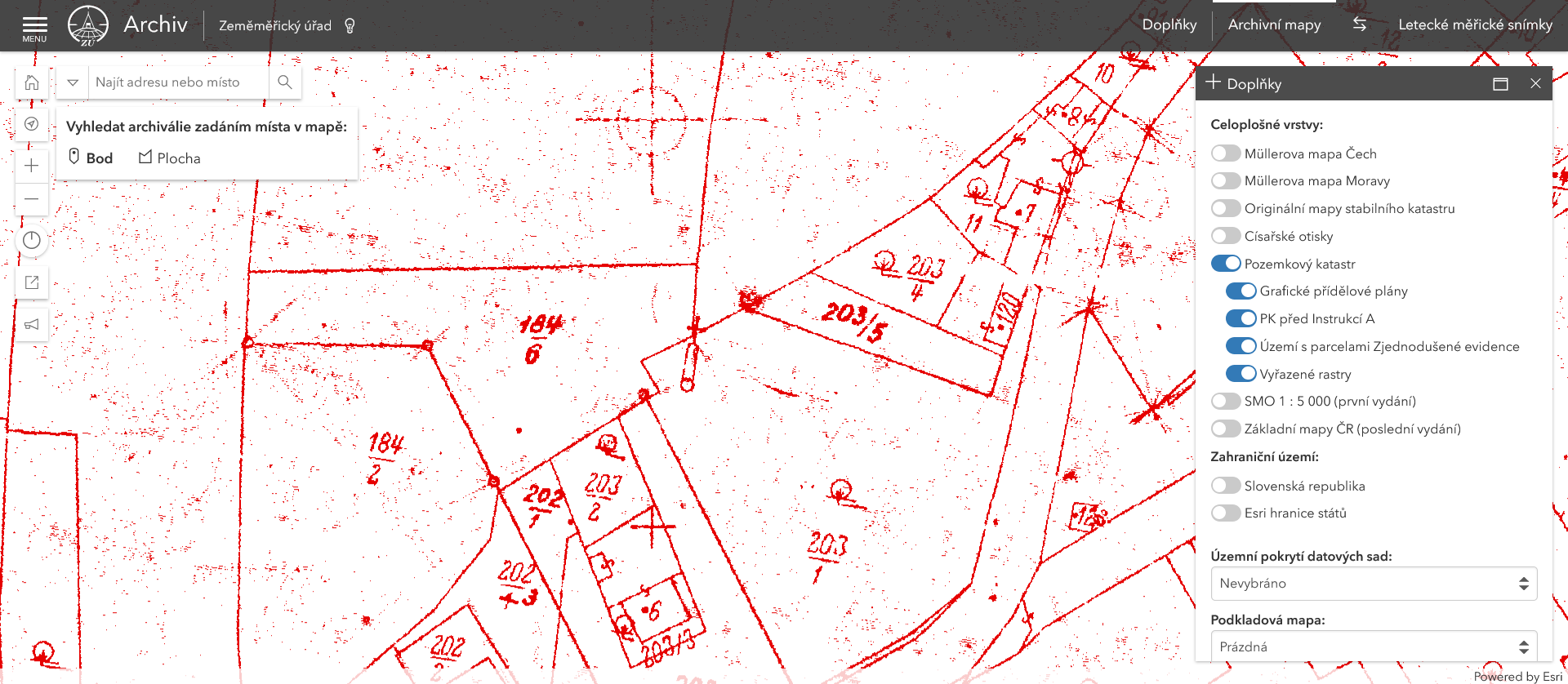- pozemkový katastr: výřez, mapa - zapnout Pozemkový katastr.